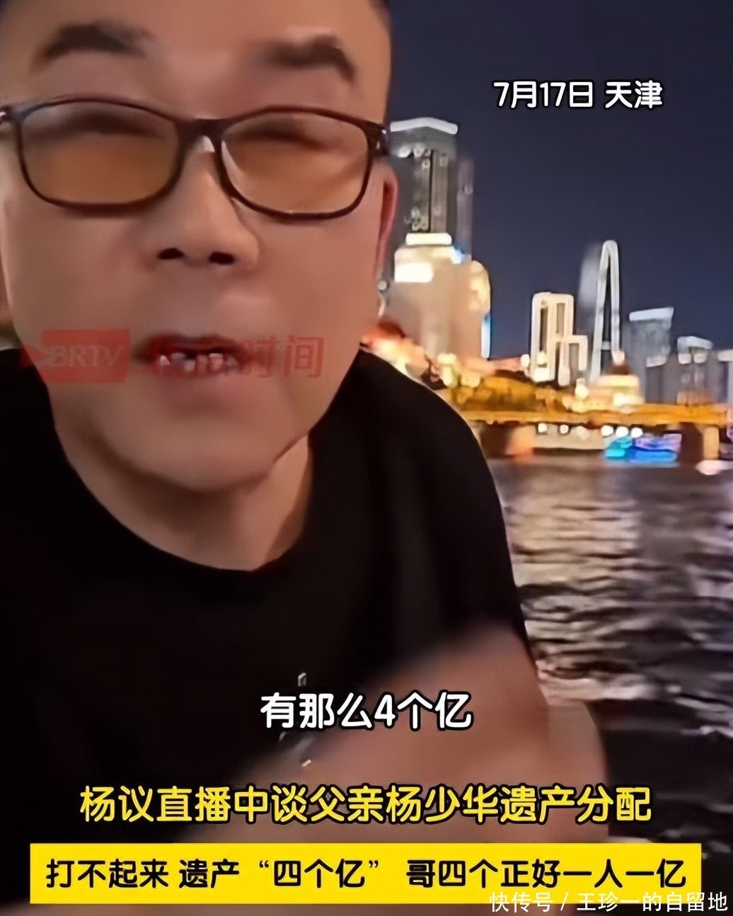 就在这两天,关于杨家的主要话题是杨议在直播中说杨少华留下了4亿遗产的事情,杨议说4亿遗产,他们兄弟4人一人分了一亿。
