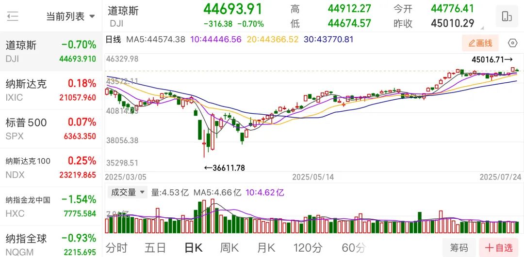 美股当天涨跌不一,道指下跌逾300点,纳指与标普500指数再创新高。截至收盘,道指跌0.7%报44693.91点,标普500指数涨0.07%报6363.35点,纳指涨0.18%报21057.96点。
